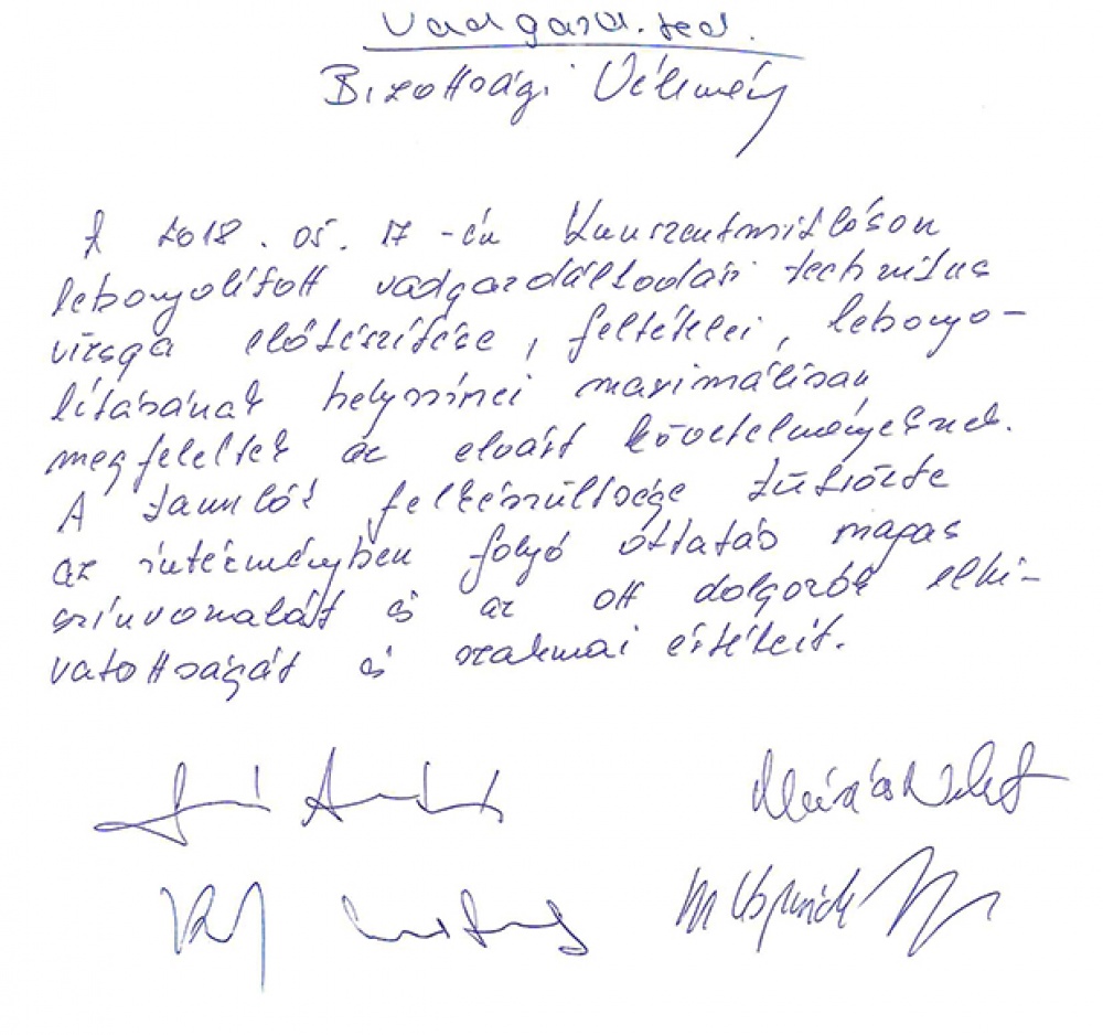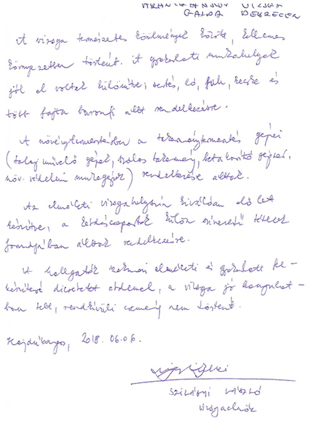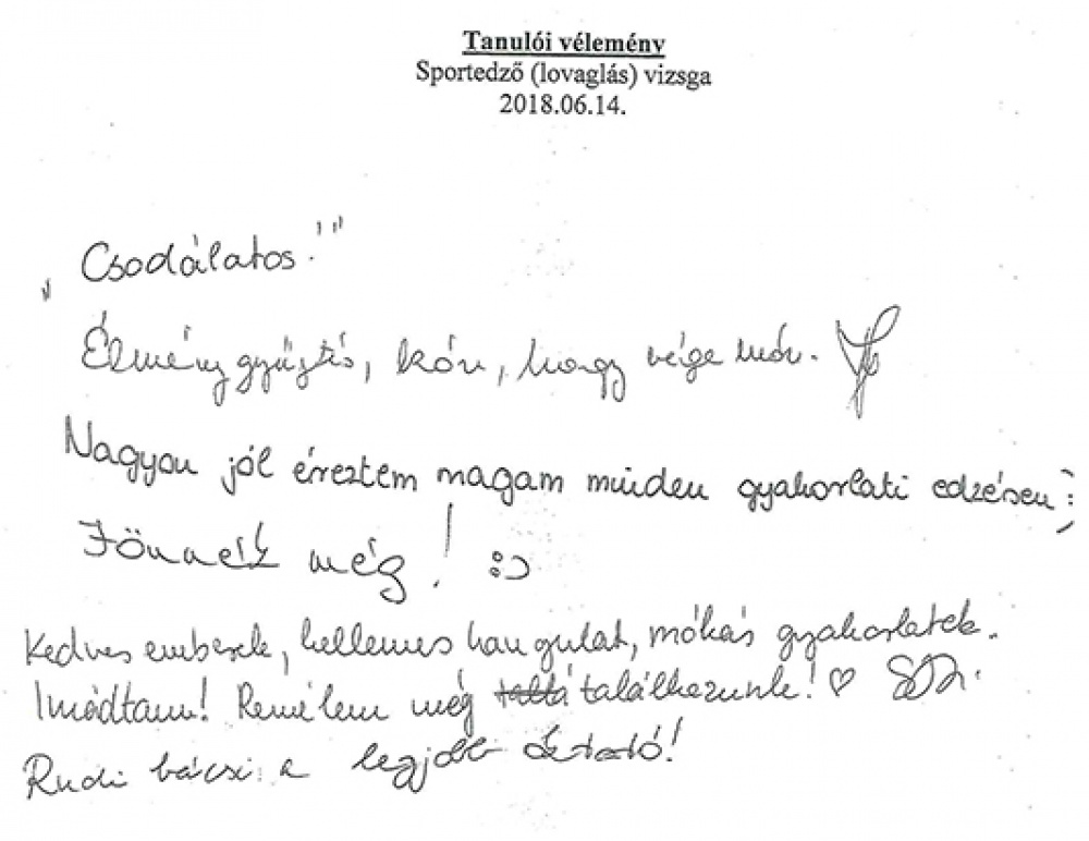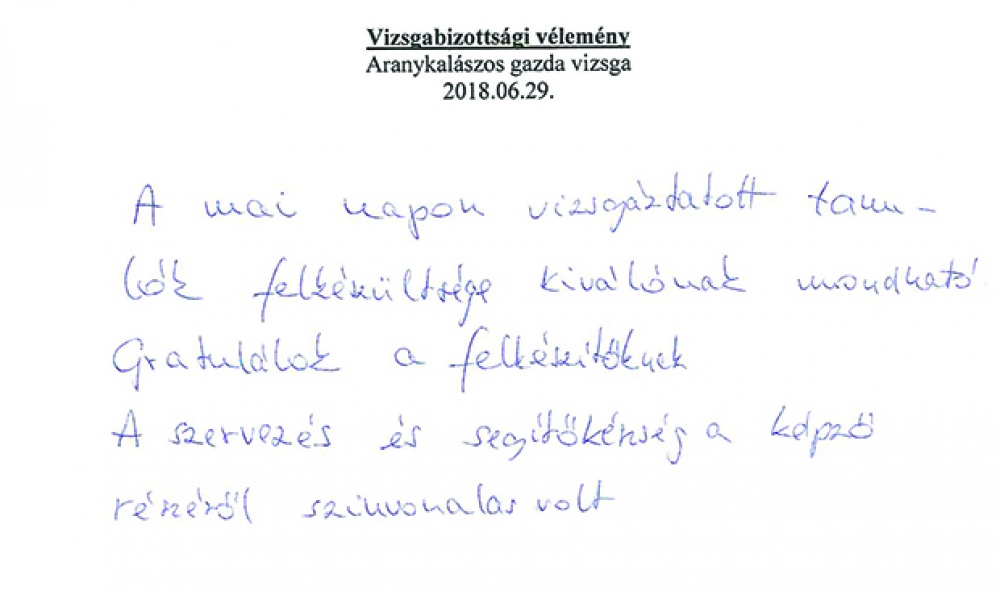 "A vizsgát gondos és határozott, pontos lebonyolítás jellemezte. A jelöltek közül csak a biztos tudásúak jelentek meg és ők alapos, jó felkészültséget mutattak. Az írásbeli feltételek, a gyakorlati munkahelyen és a szóbeli helyszínei megfelelőek, tiszták, rendezettek voltak. A vizsgairatok, a tanulói anyagok nagy gondosságról, körültekintésről tanúskodtak. Köszönet az ilyen lelkiismeretes munkáért, a vizsgáztatók munkájáért. A jelöltek viselkedése, megjelenése ugyancsak tükrözte a következetes felkészítő munka hatásait. További sikeres, áldozatkész, gondos munkát kívánunk minden munkatársnak." - Vizsgaelnöki értékelés (2018.05.25. Hűtő, klíma és hőszivattyú berendezés-szerelő vizsga).